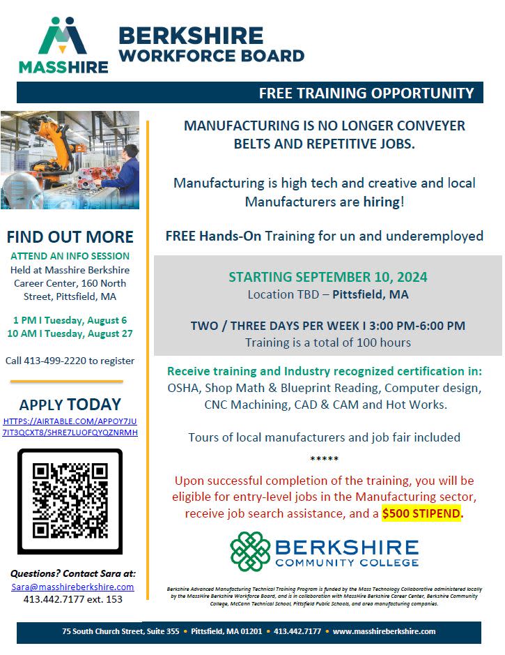 Attend an upcoming information session at MassHire Berkshire Career Center, 160 North Street in Pittsfield at 1PM on Tuesday, August 6th or 10AM on Tuesday, August 27th.  Questions? Contact Sara@masshireberkshire.com or 413.442.7177 ext 153.