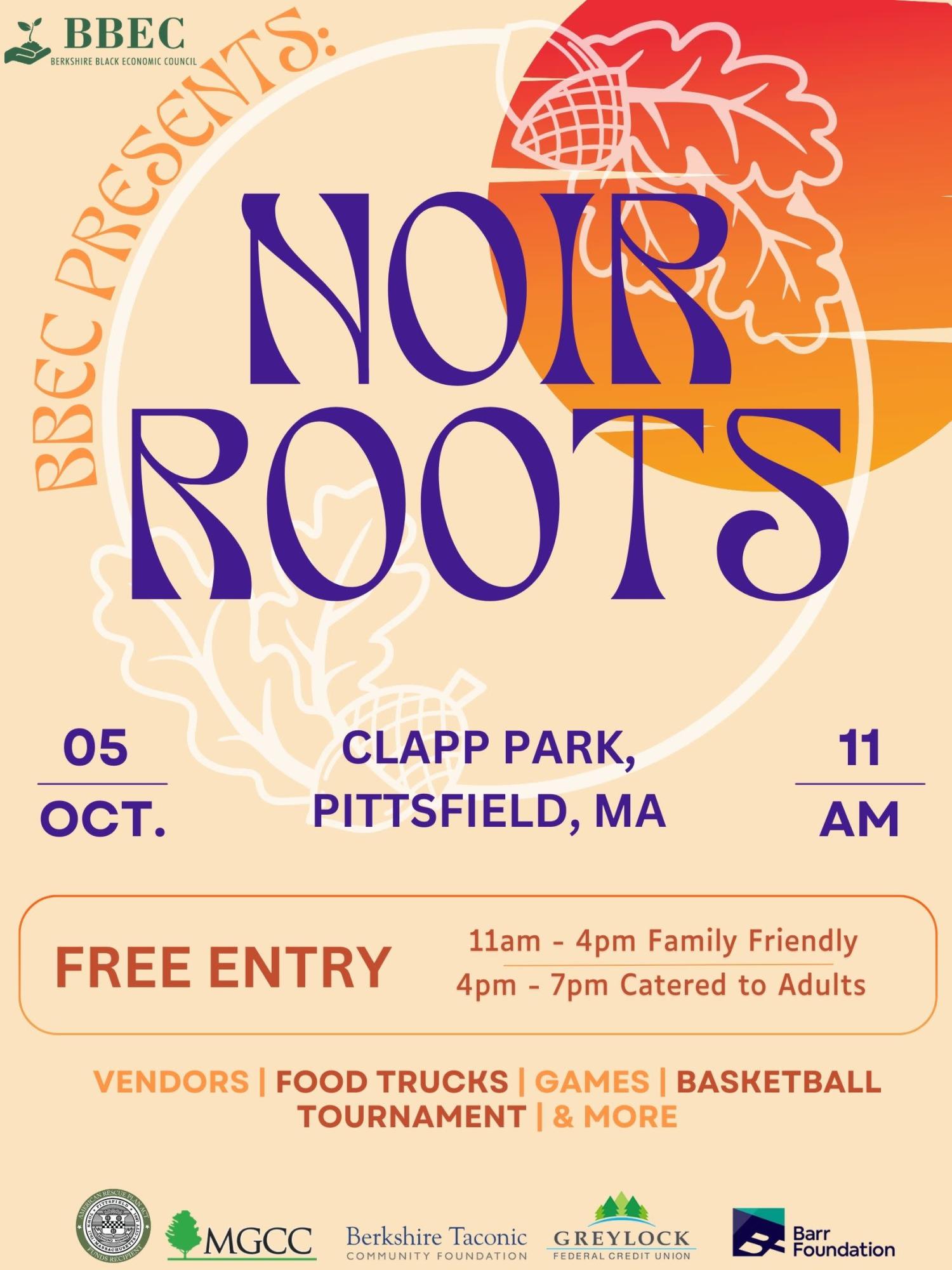 Pittsfield, MA – The Berkshire Black Economic Council is excited to announce “Noir Roots” at Clapp Park in Pittsfield, Massachusetts happening October 5th.